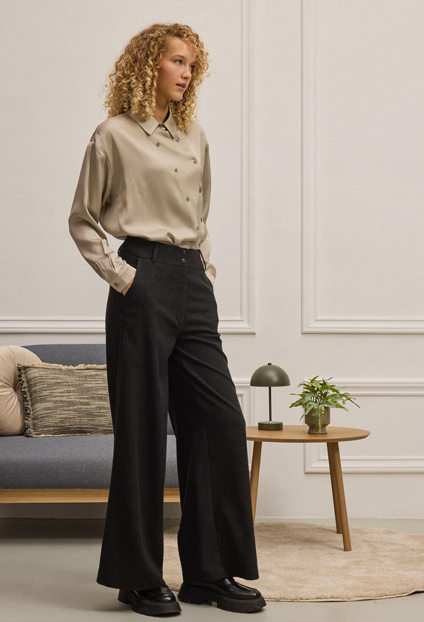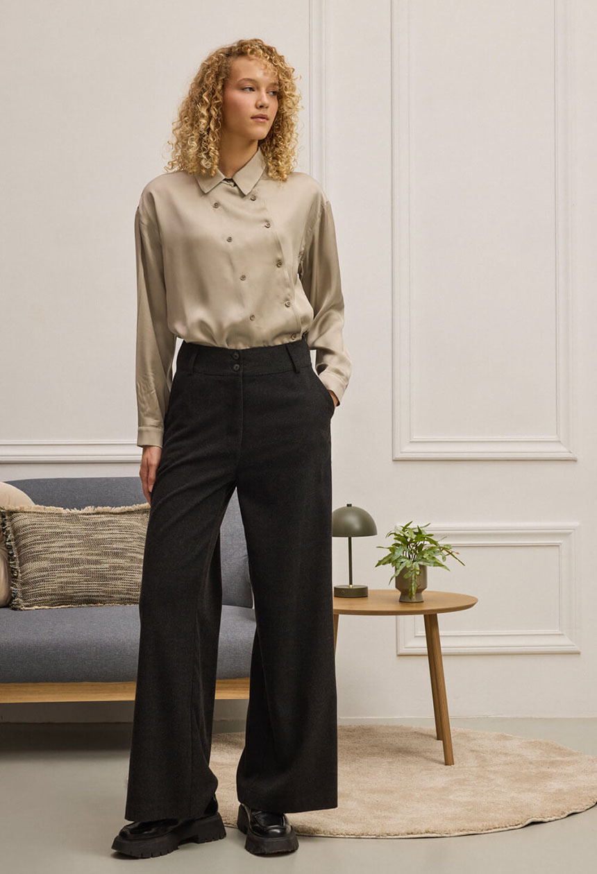 Παντελόνι ψηλόμεσο σε μαλακό ύφασμα με διαγωνάλ ύφανση, που συνδυάζει κλασική κομψότητα με μοντέρνες λεπτομέρειες. Διαθέτει κοφτές τσέπες μπροστά και φιλέτο πίσω, κλείνει με δύο κουμπιά και φερμουάρ, ενώ τα θυλάκια στη μέση επιτρέπουν την προσθήκη ζώνης για ακόμα πιο προσωπικό στυλ. Συνδυάζεται άψογα με το σακάκι IRMAK μια ευέλικτη επιλογή για κάθε περίσταση.
