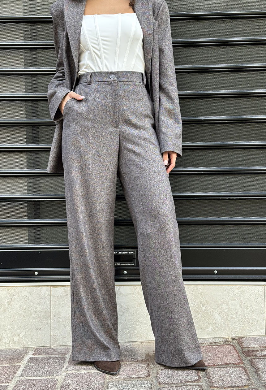 Παντελόνα ψηλόμεση,κανονική εφαρμογή,ιδιαίτερη ύφανση τύπου tweed,κλείνει με κουμπί και φερμουάρ.