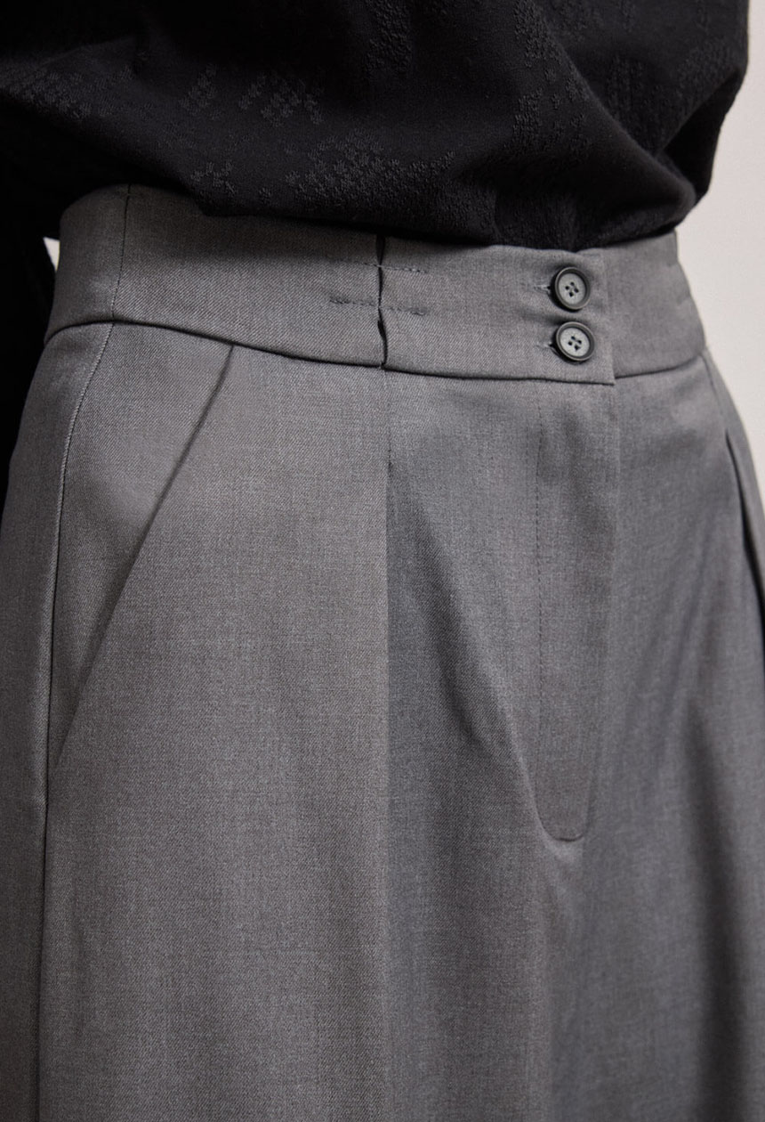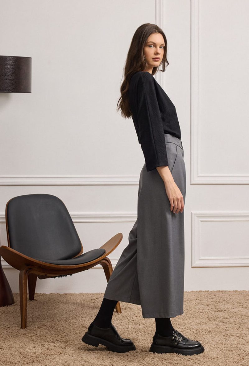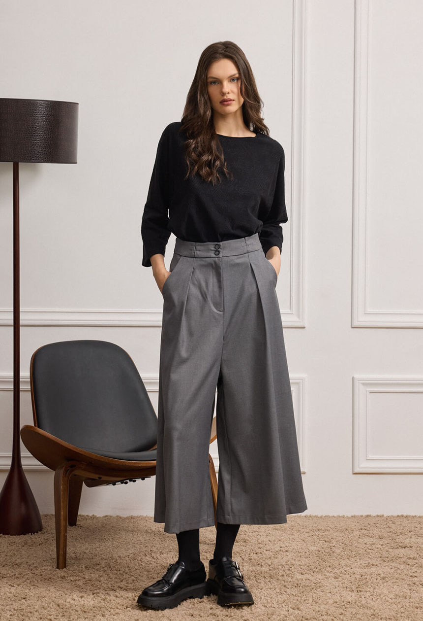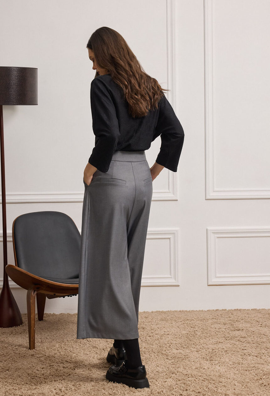 Ψηλόμεσο παντελόνι zip culotte, σε φαρδιά γραμμή, συνδυάζει την άνεση με τον εκλεπτυσμένο σχεδιασμό. Οι πιέτες μπροστά προσδίδουν μία κομψή αίσθηση δίνοντας κίνηση, ενώ οι κοφτές τσέπες μπροστά και το διακοσμητικό φιλέτο πίσω προσφέρουν ένα μοντέρνο και πρακτικό στοιχείο στο σχέδιο. Το παντελόνι κλείνει με κουμπί και φερμουάρ για τέλεια εφαρμογή, ενώ η πιέτα στο ζωνάκι ενισχύει τη γραμμή του. . Συνδυάζεται άψογα με το σακάκι FERGUS μια ευέλικτη επιλογή για κάθε περίσταση.