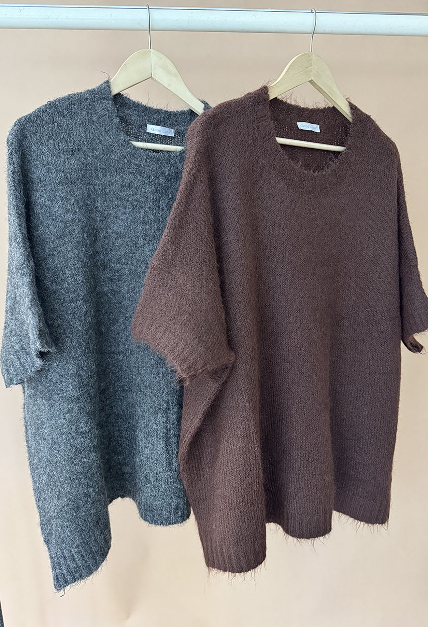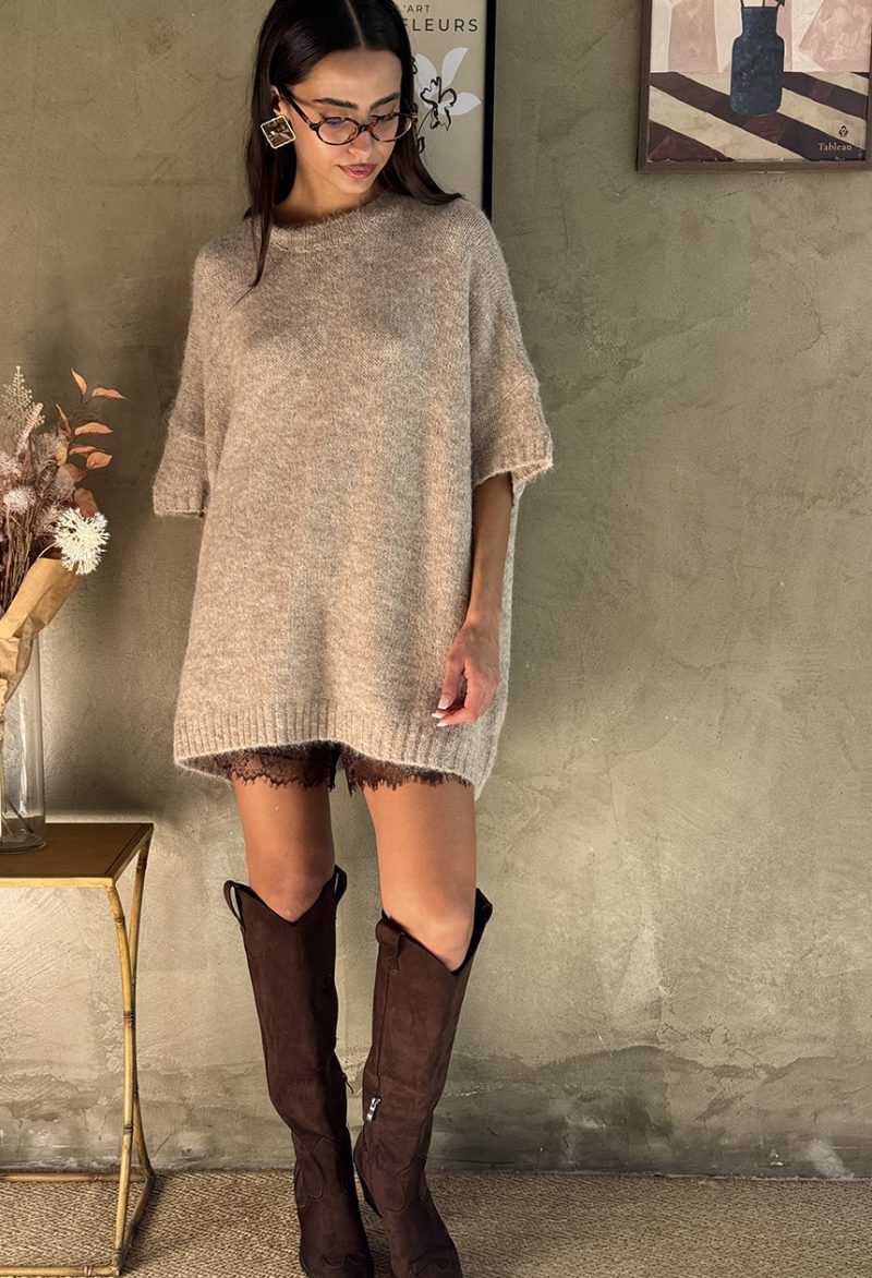 Πλεκτή μπλούζα,σε μήκος που μπορεί να φορεθεί και σαν φόρεμα,με ριχτή φαρδιά γραμμή,λαιμόκοψη,κοντό τρουακάρ μανίκι,από ελαστικό μαλακό νήμα.