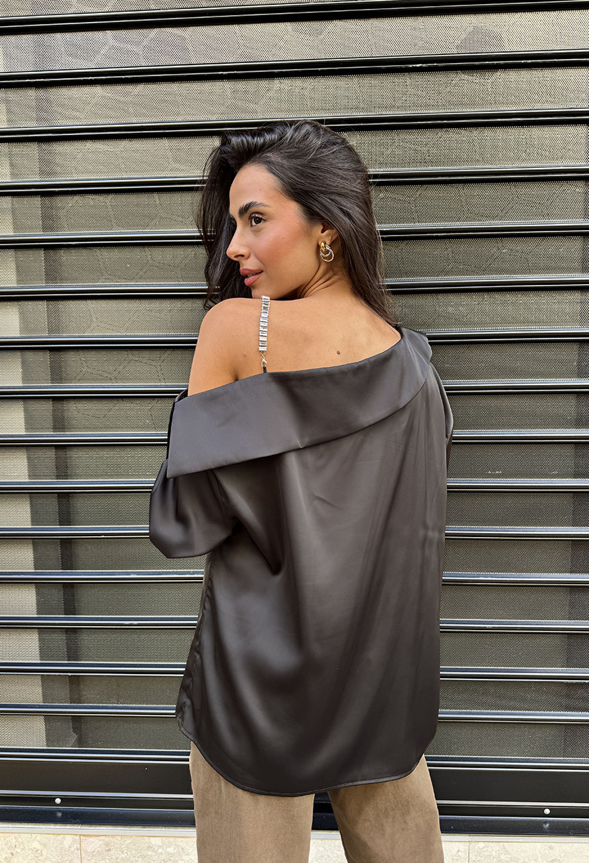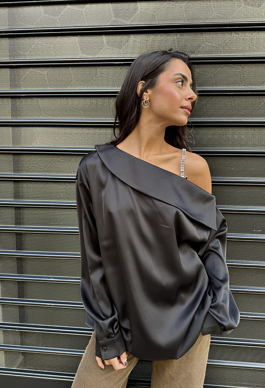 Σατέν πουκαμίσα με έξω ώμο, με αποσπώμενη τιράντα στρας. Με κουμπι στο τελείωμα στα μανίκια. Ιδανικό για βραδινή έξοδο.