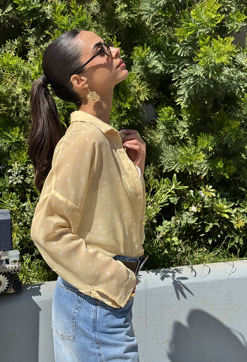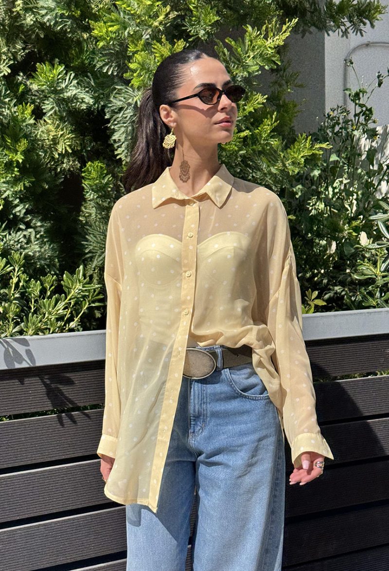 Πουκαμίσα πουά,σε ριχτή άνετη γραμμή,πεσμένοι ώμοι που δίνουν χαλαρότητα,γιακάς,κουμπιά,από μαλακό δροσερό ύφασμα.