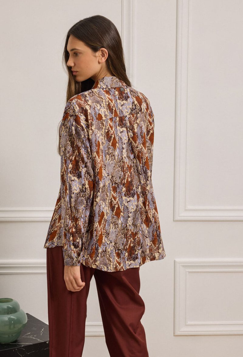 Πουκάμισο με έντονο snake print. Η σύνθεση από 100% viscose προσφέρει απαλή υφή. Τα μακριά μανίκια καταλήγουν σε μανσέτες με κουμπί.