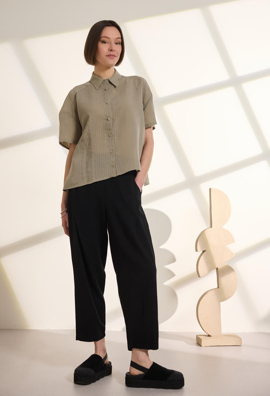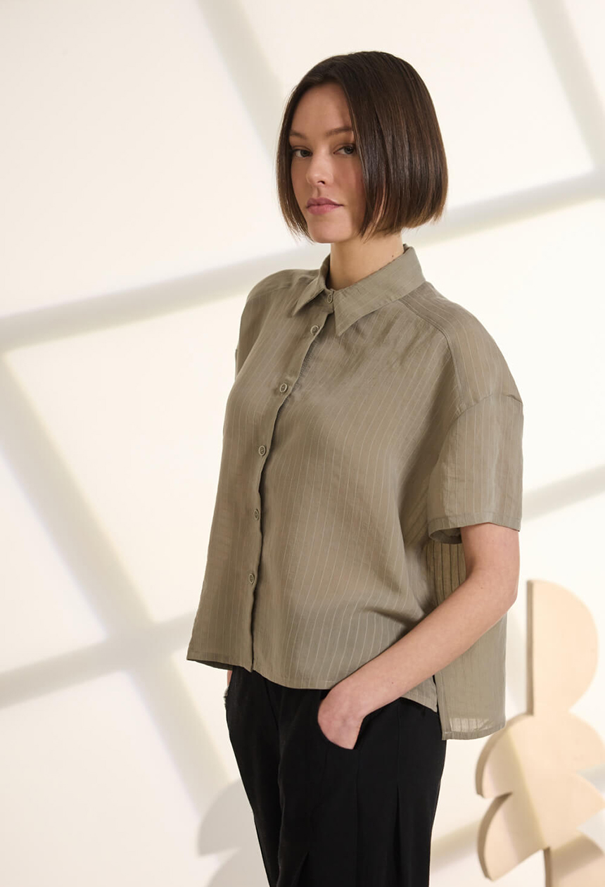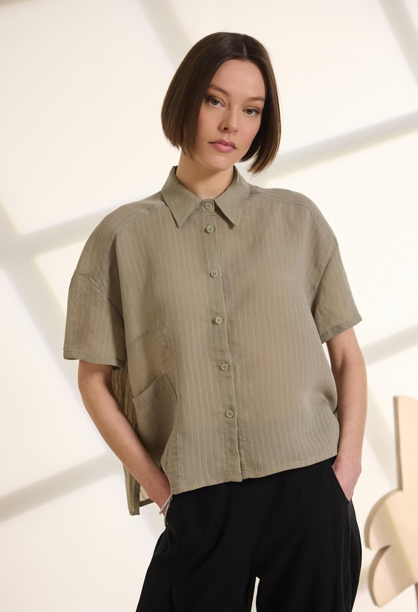 Πουκάμισο με γιακά και κλείσιμο με κουμπιά, σε άνετη τετράγωνη γραμμή και κοντά μανίκια. Διακοσμείται με κάθετη ρίγα σε όλο το μήκος, ενώ η μπροστινή χαμηλή τσέπη ξεχωρίζει με εναλλαγή ριγών, συνδυάζοντας οριζόντια και κάθετη κατεύθυνση για ενδιαφέρον σχεδιαστικό αποτέλεσμα. Τα ανοίγματα στα πλαϊνά ολοκληρώνουν το σχέδιο, προσφέροντας άνεση και ελευθερία κινήσεων.