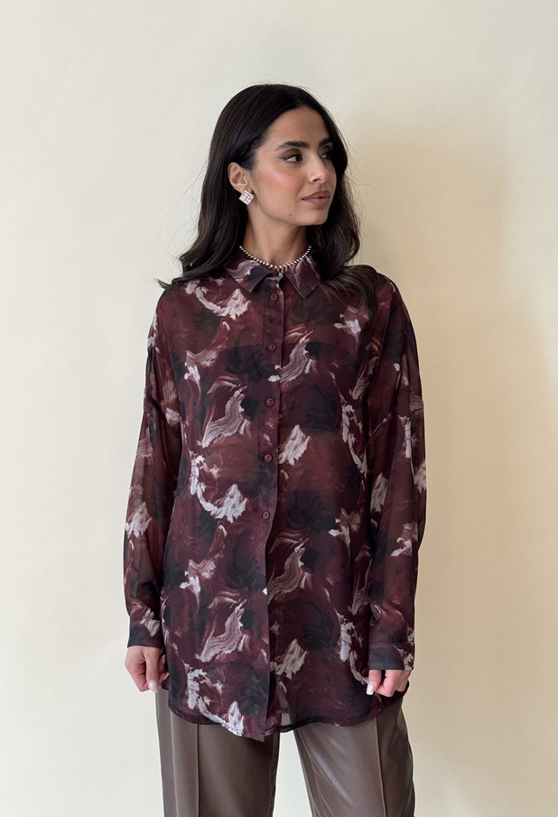 Πουκάμισο σε ριχτή γραμμή,ελαφρώς ασύμμετρο,κουμπιά,γιακάς,από ημιδάφανο φλοράλ ύφασμα με μεταξωτή υφή.