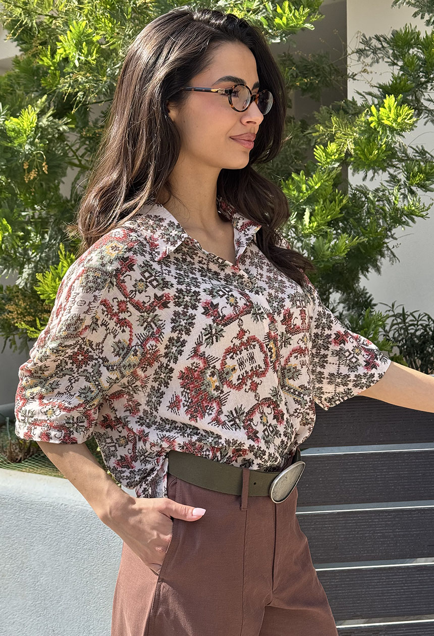 Πουκάμισο με εμπριμέ σχέδιο,σε χαλαρή ριχτή γραμμή,γιακάς,κοντό μανίκι,με πλαινά ανοίγματα που ενισχύουν τη κίνηση.
