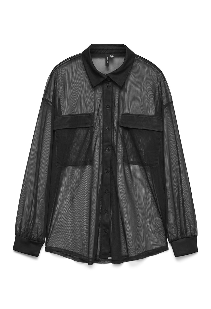 Πουκάμισο ημιδιάφανο, σε μακριά ριχτή γραμμή,τετράγωνες τσέπες μπροστά,λεπτή μανσέτα,γιακάς,κλείνει με κουμπιά.