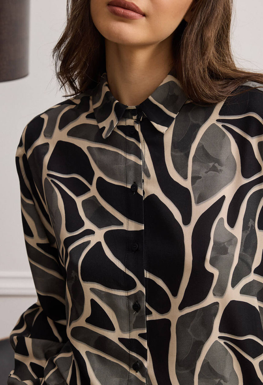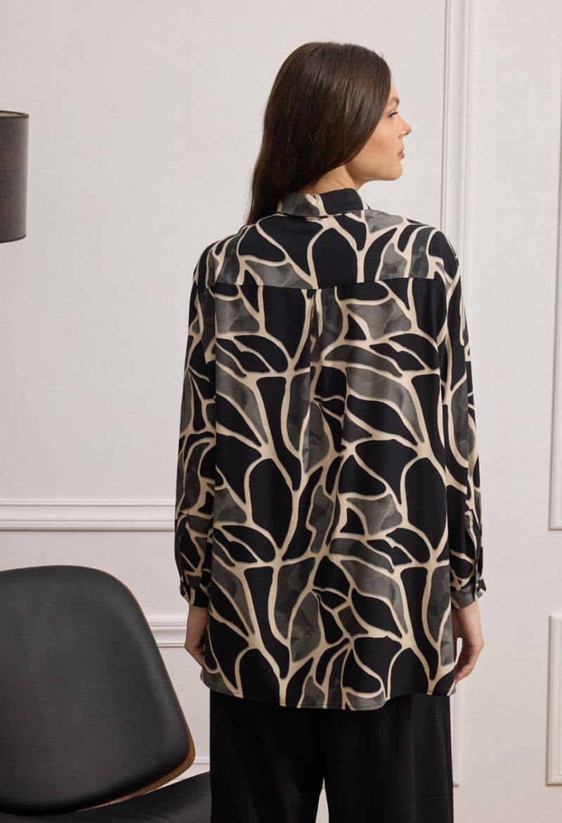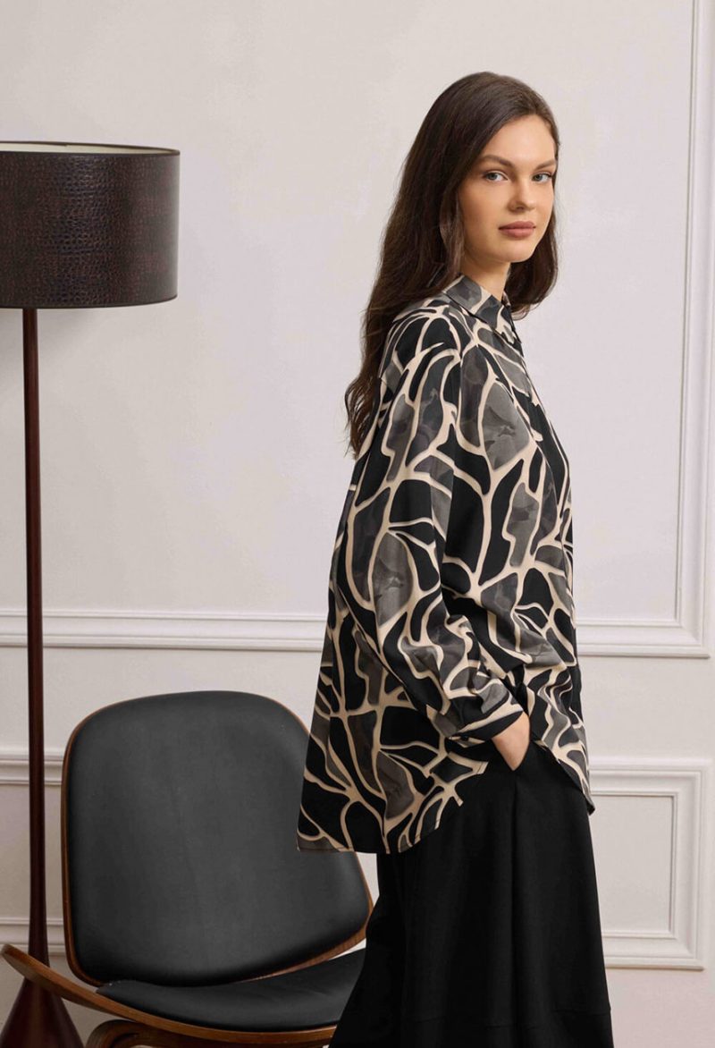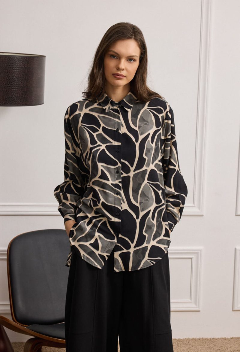 Oversized πουκάμισο από 100% βισκόζη με κλασικό γιακά και μακρύ μανίκι που καταλήγει σε μανσέτα με κουμπί. Κλείνει μπροστά με πατιλέτα και κουμπιά, αναδεικνύοντας την γραμμή του σχεδίου. Το ασύμμετρο τελείωμα χαρίζει κίνηση, ενώ το print εμπνευσμένο από περίτεχνα μωσαϊκά δημιουργεί ένα εντυπωσιακό, almost-αρτιστίκ αποτέλεσμα που δίνει χαρακτήρα στο look.