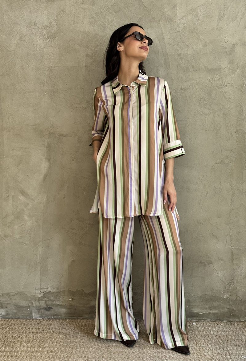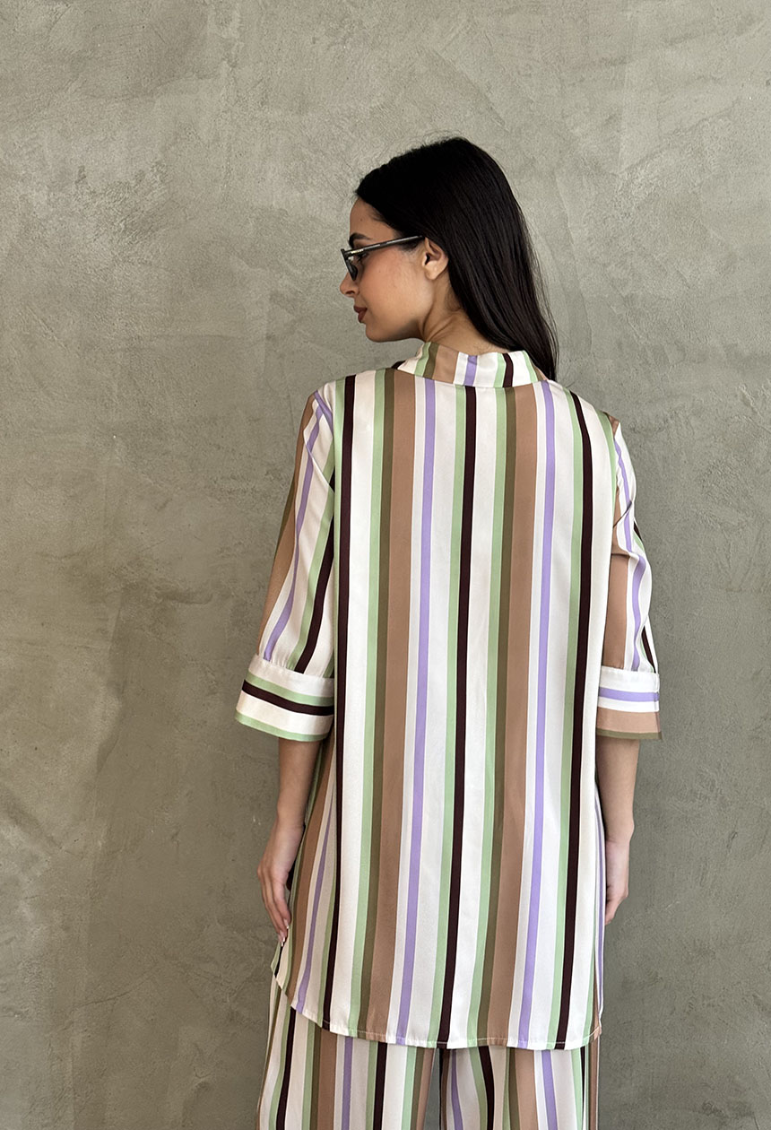 Πουκάμισο με ριγέ σχέδιο σε ριχτή γραμμή, σκίσιμο στο πλάι, με ιδιαίτερα μανίκια 3/4, γιακάς. Κλείνει με κουμπιά.