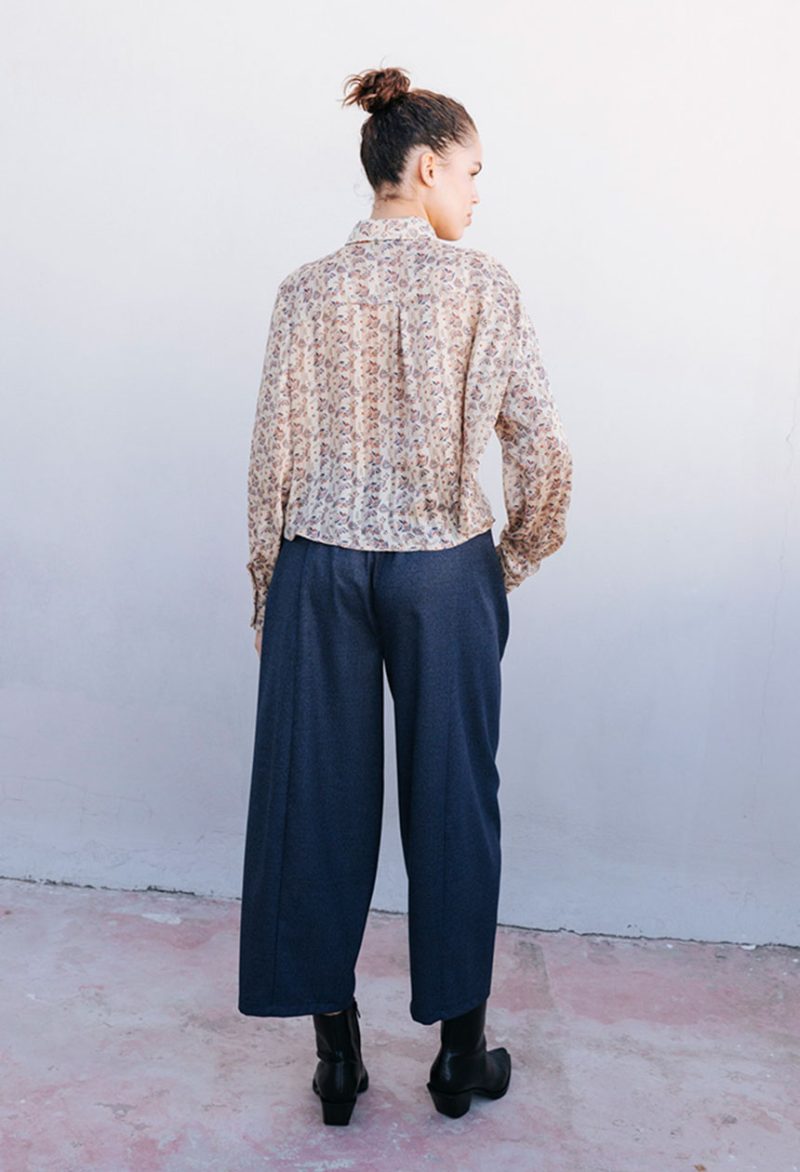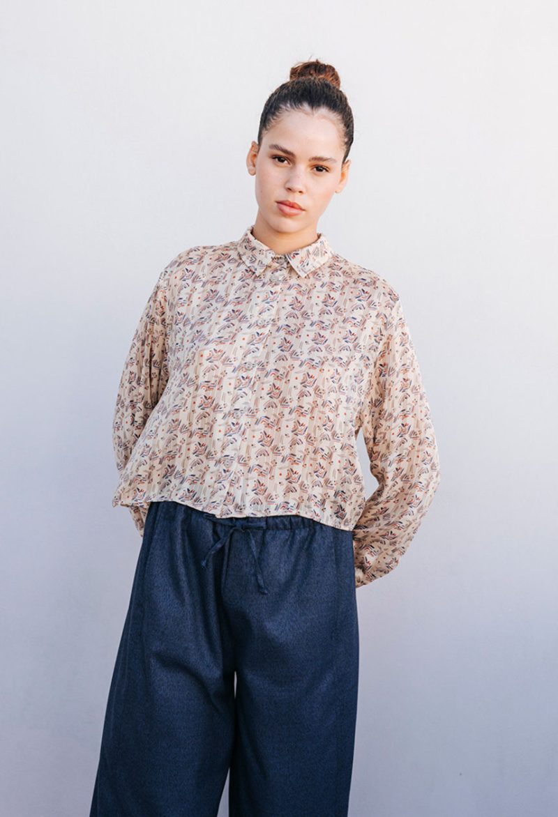 Εμπριμέ see-through πουκάμισο κοντό με γιακά. Κλείσιμο μπροστά με κουμπιά.