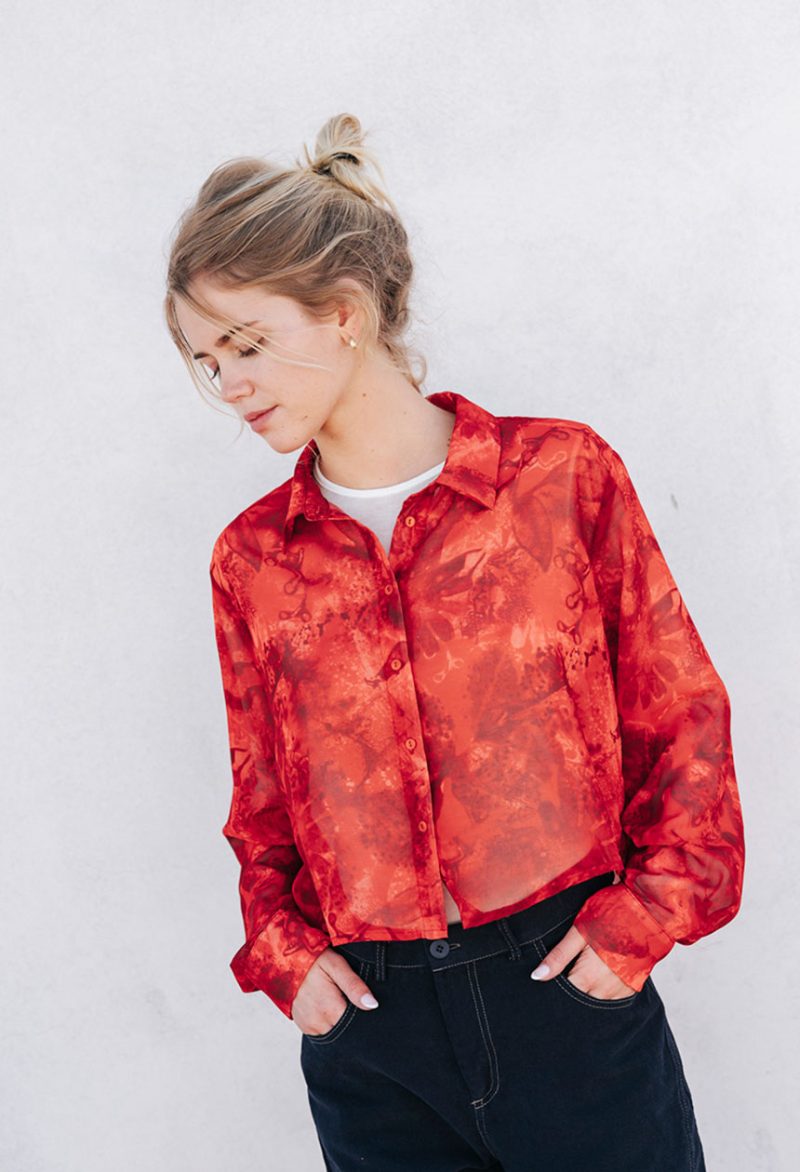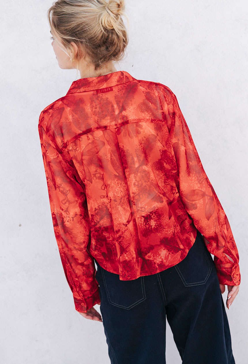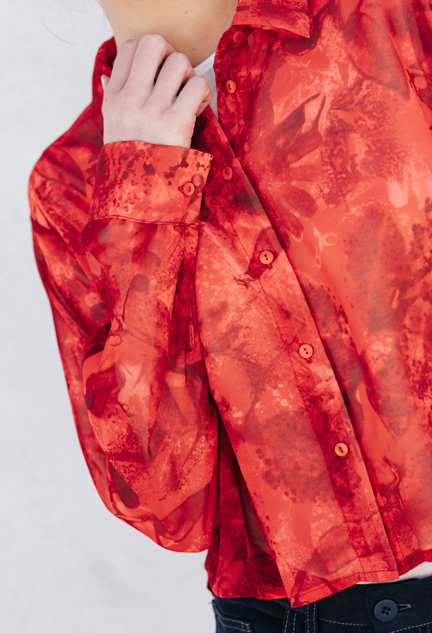 Εμπριμέ see-through πουκάμισο κοντό με γιακά. Κλείσιμο μπροστά με κουμπιά.