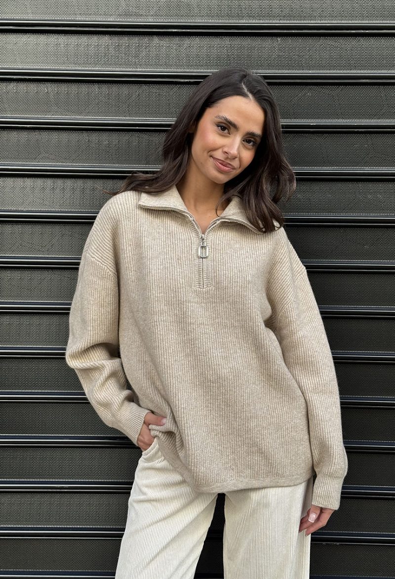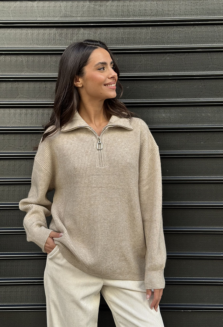 Πλεκτό πουλόβερ,μακρυμάνικο, σε ριχτή γραμμή,με ψηλό λαιμό και κλείσιμο μπροστά με μισό φερμουάρ.