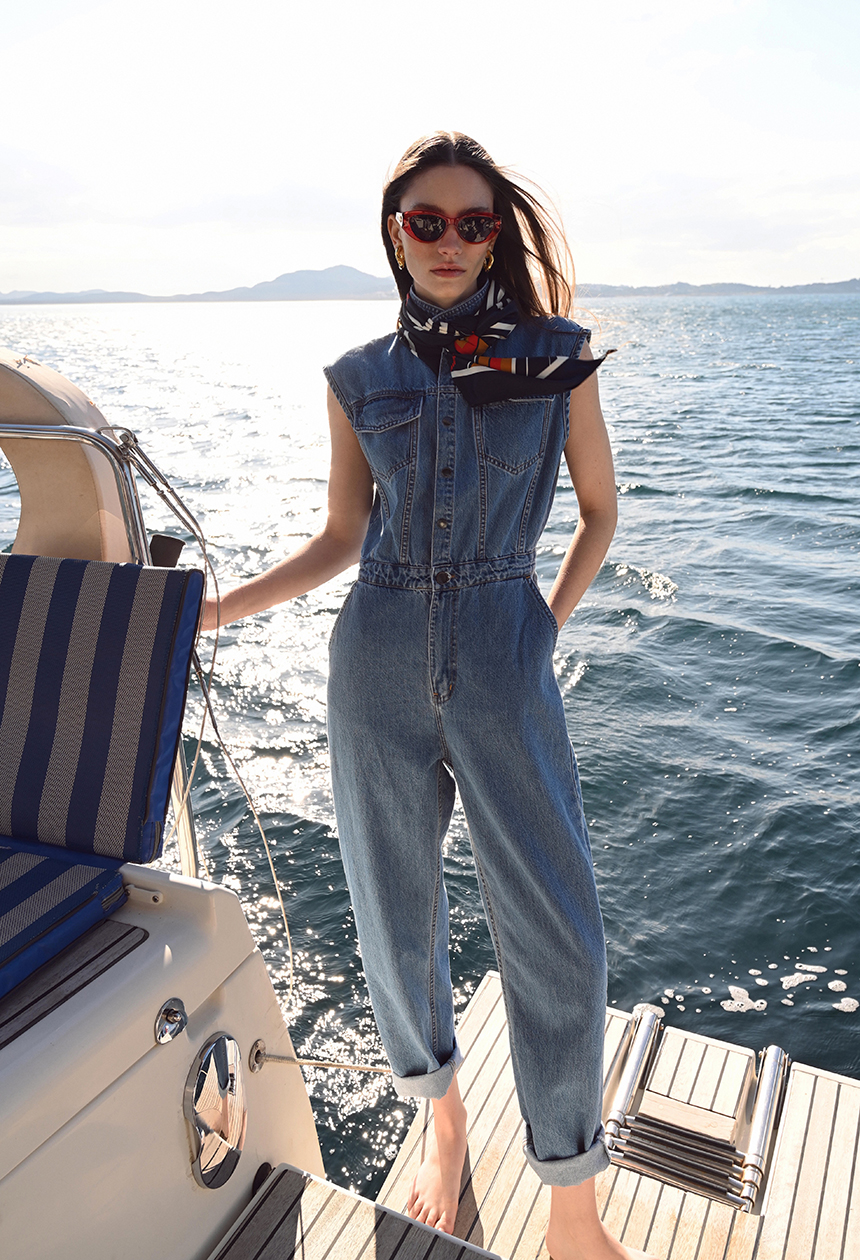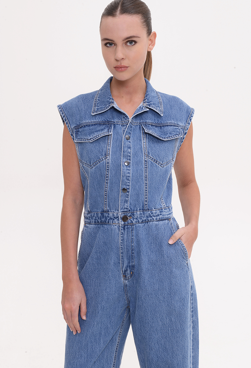 Μοντέρνα denim ολόσωμη φόρμα. Το αμάνικο σχέδιο και η χαλαρή γραμμή δημιουργούν μια κομψή αλλά ταυτόχρονα casual εμφάνιση. Διαθέτει πλαϊνές τσέπες.