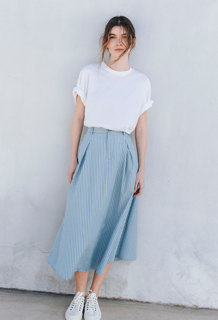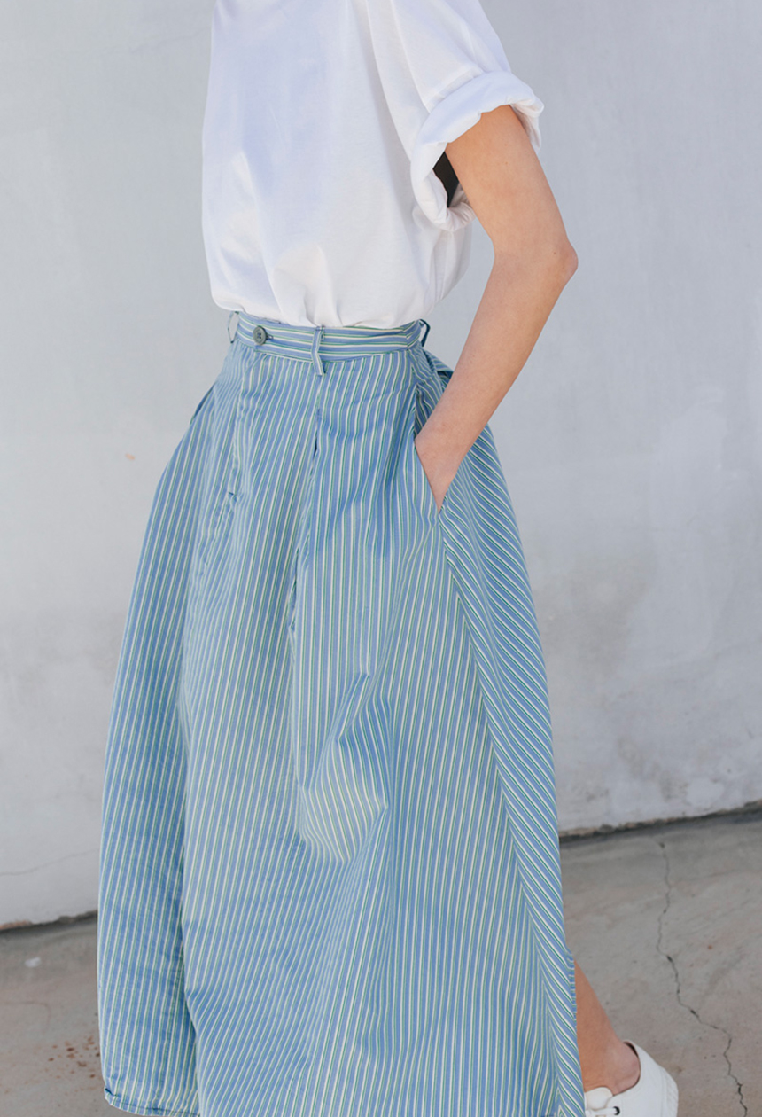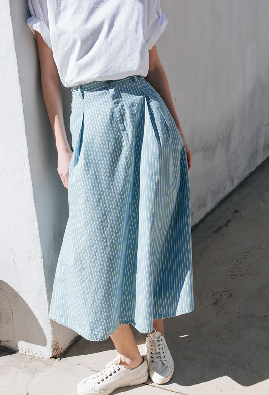 Μακριά φούστα ριγέ, με τσέπες στο πλάι, πιέτα,κλείσιμο μπροστά με κουμπί και φερμουάρ