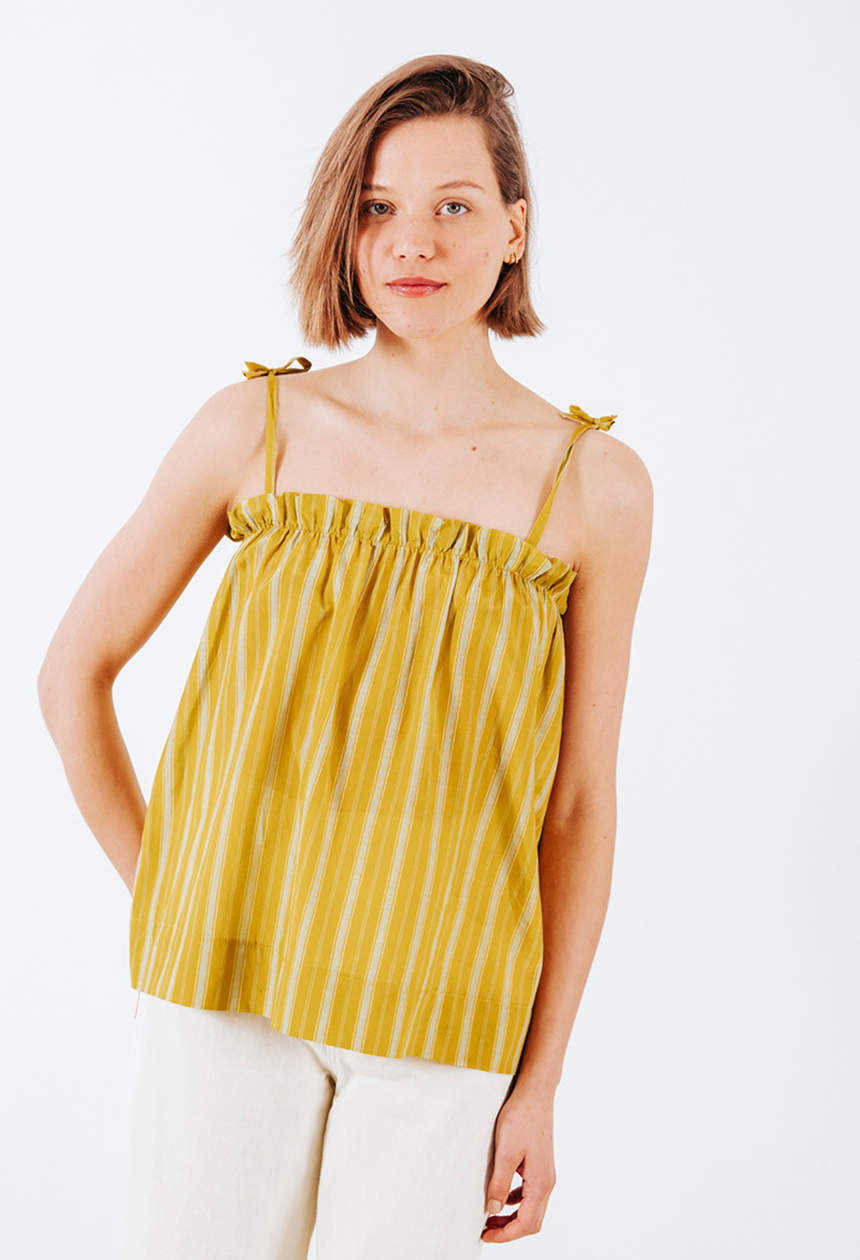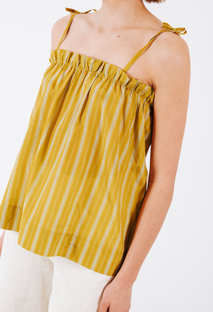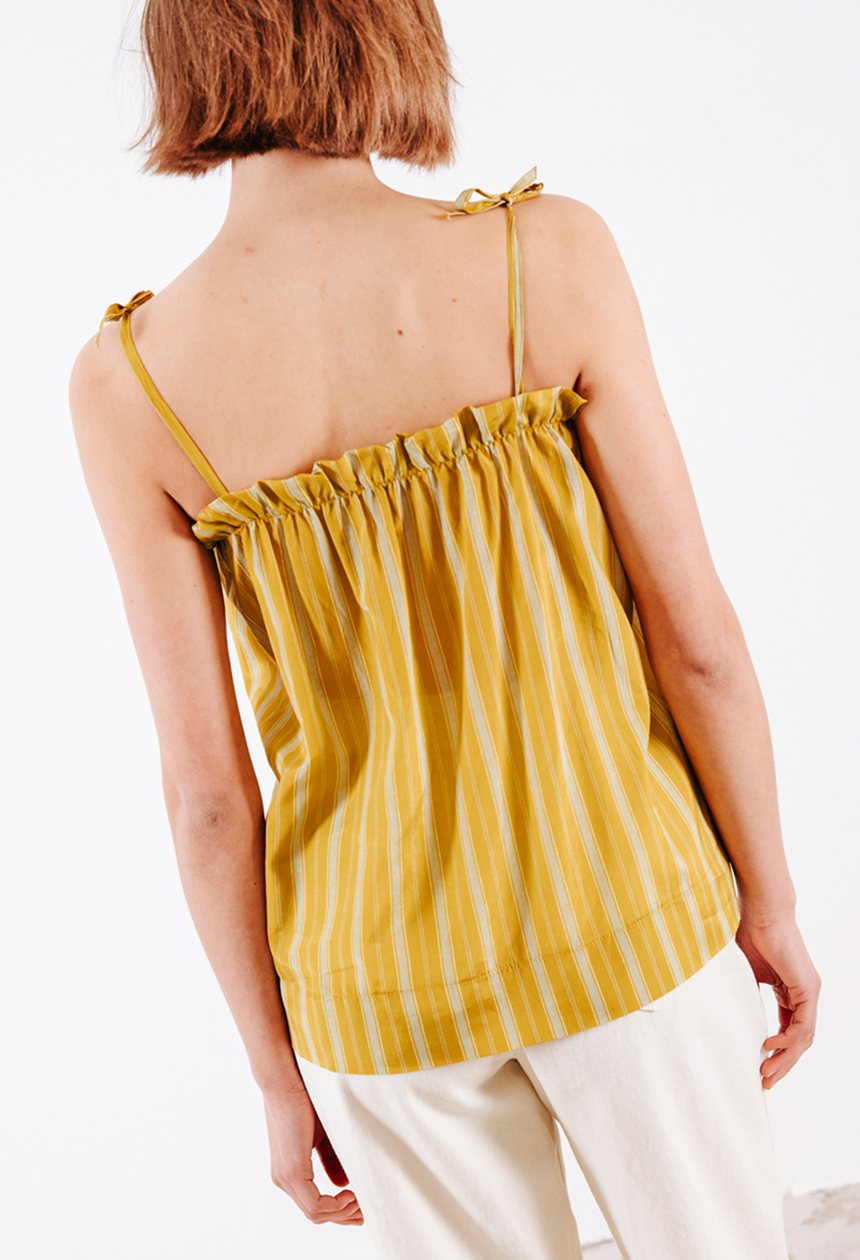Ριγέ μπλούζα με λάστιχο στο ντεκολτέ, λεπτές τιράντες και δέσιμο.