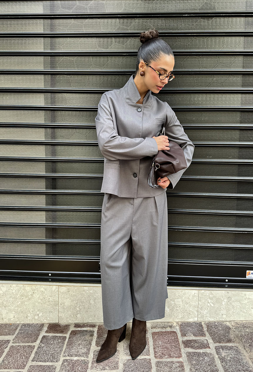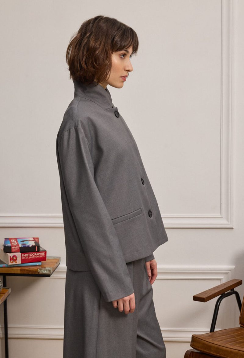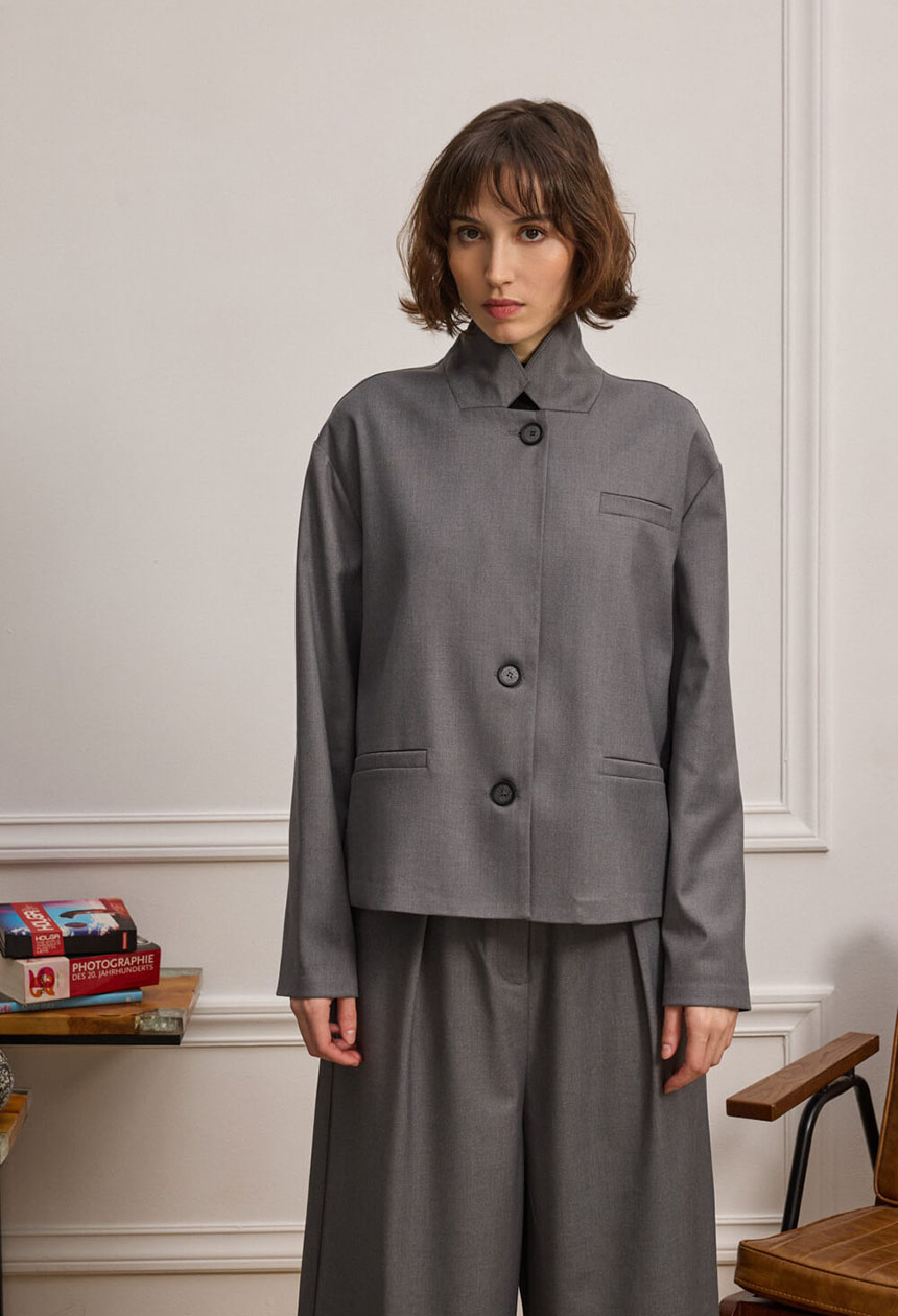 Cropped σακάκι με ανατρεπτικό γιακά Ένα κομμάτι με έξυπνο design, που προσαρμόζεται στο στυλ σου. Ο σχεδιαστικός γιακάς πέτο κρύβει μια ανατρεπτική λεπτομέρεια: κλείνει με κουμπί και μετατρέπεται σε μίνιμαλ mao, προσφέροντας δύο εμφανίσεις σε μία.Η ίσια, άνετη γραμμή του προσφέρει ισορροπία ανάμεσα στη δομή και την ελευθερία κινήσεων. Διαθέτει φόδρα, διακριτικές τσέπες με φιλέτο και μια διακοσμητική στο στήθος, που ολοκληρώνει το tailoring ύφος με λεπτότητα. Ταιριάζει άψογα με το παντελόνι Cantrelle.