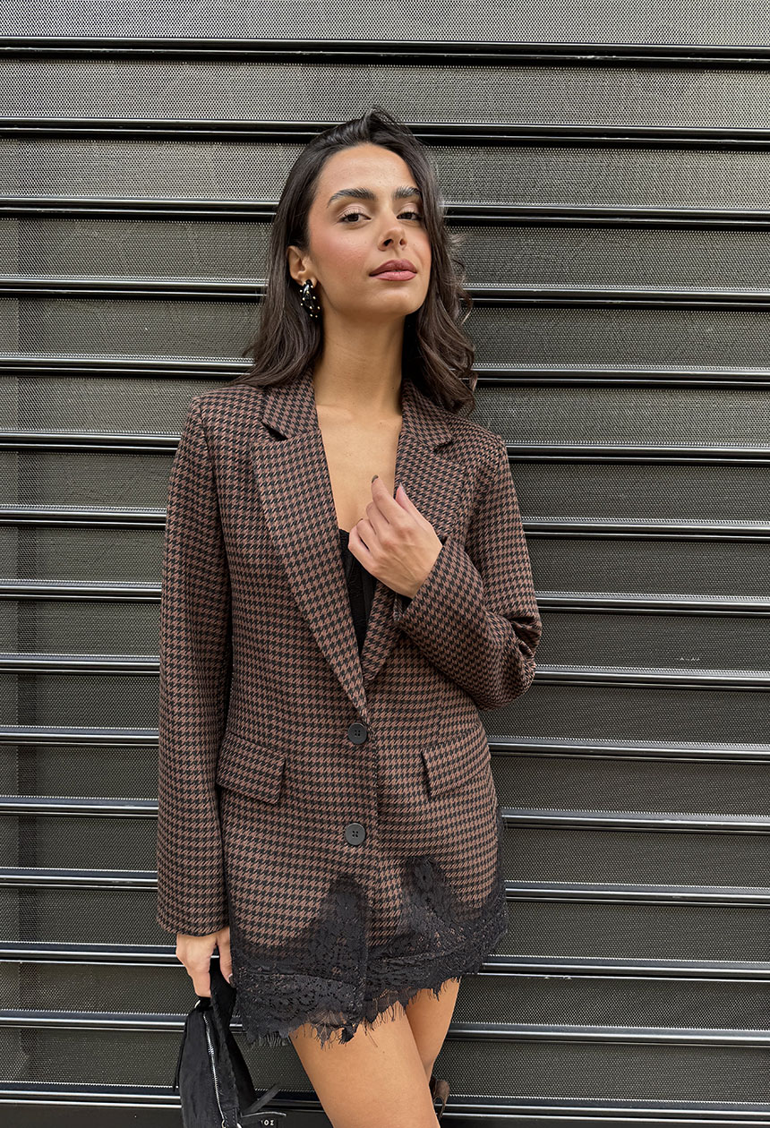 Σακάκι τουίντ καρό με αποχρώσεις μαύρο και καφέ. Κανονική εφαρμογή, με ιδιαίτερη δαντέλα σχέδιο στο τελείωμα και μπροστινές τσέπες. Συνδυάζεται με το σκορτ Marrone.