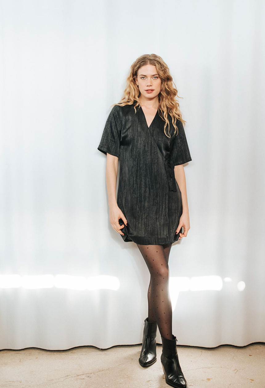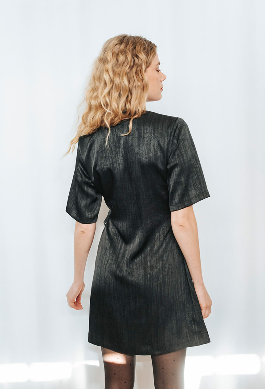 Σατέν μίνι φόρεμα κρουαζέ, με V λαιμόκοψη και κλείσιμο εσωτερικά με φερμουάρ.