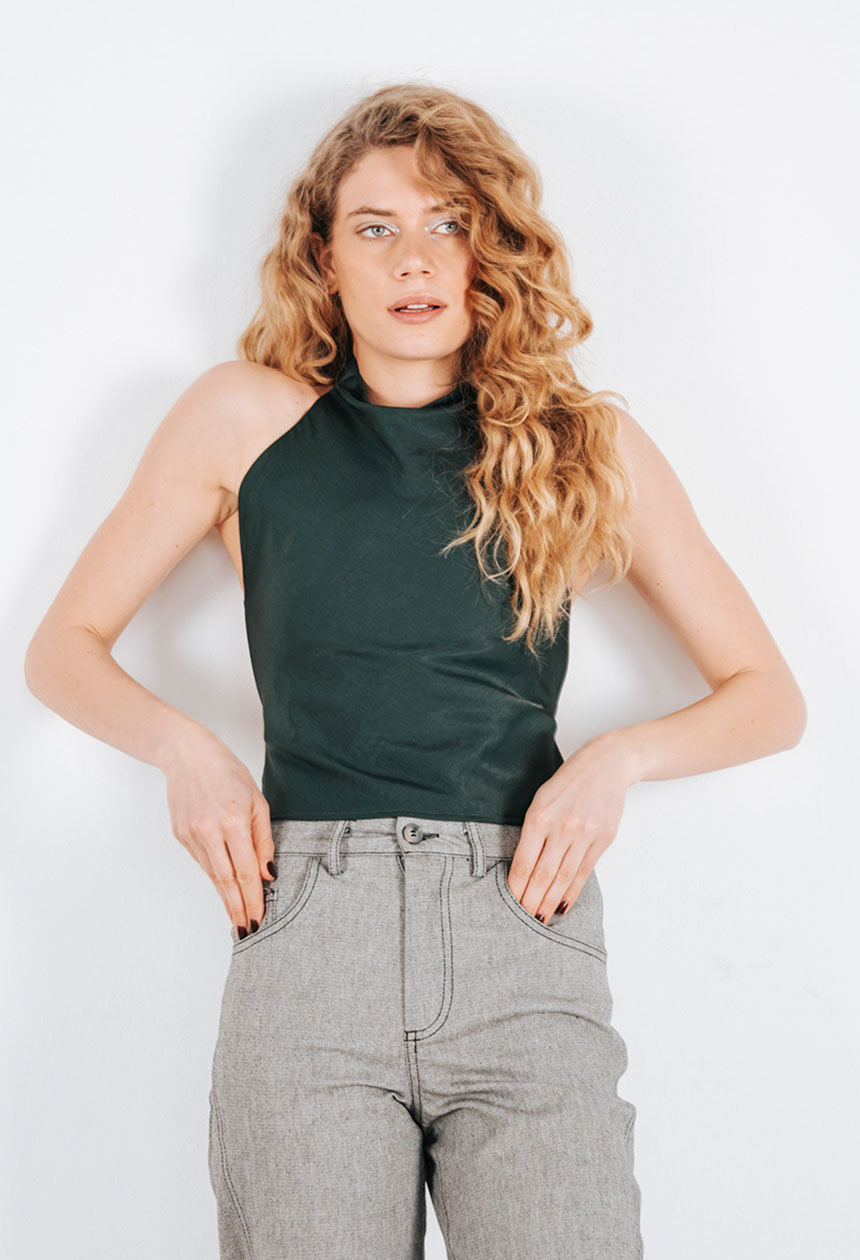 Σατέν μπλούζα με λάστιχα στην πλάτη και δέσιμο πίσω στον λαιμό με κουμπιά.