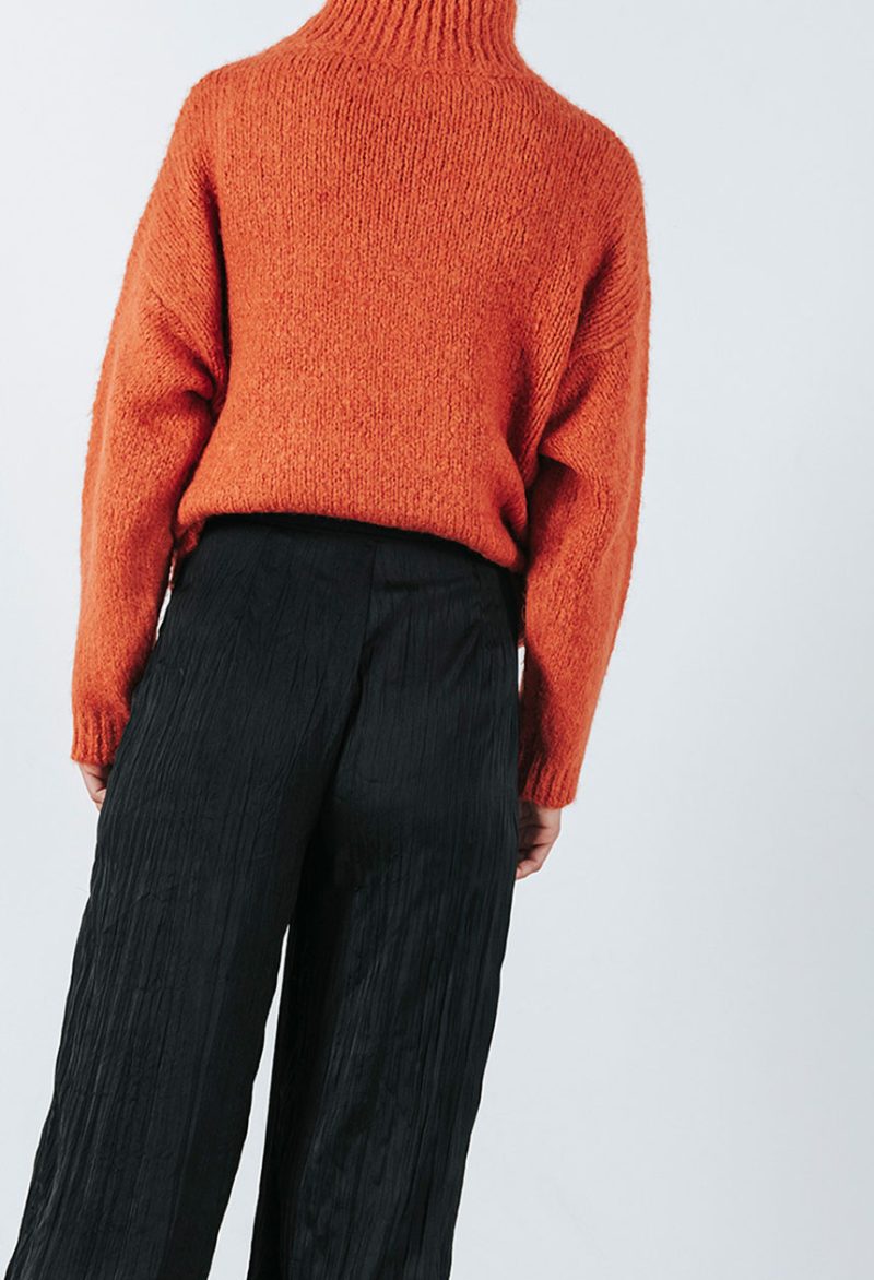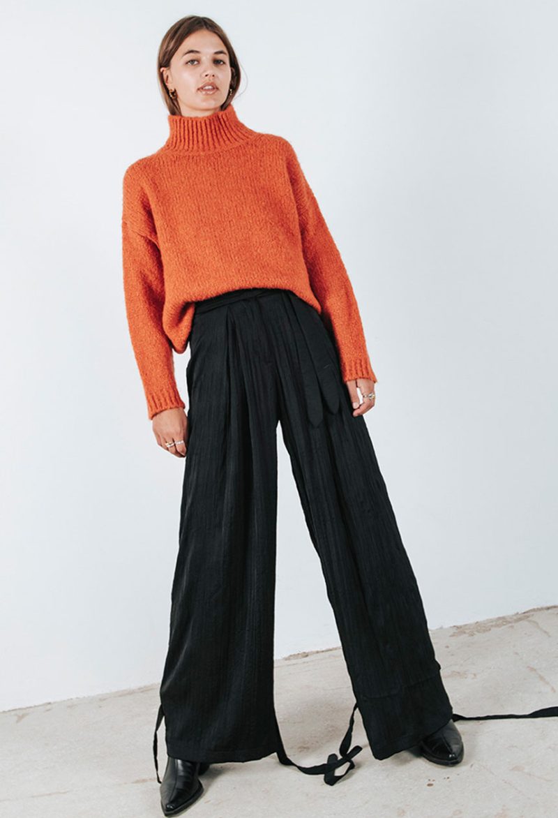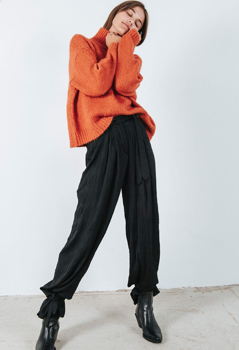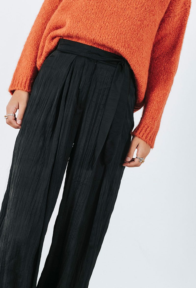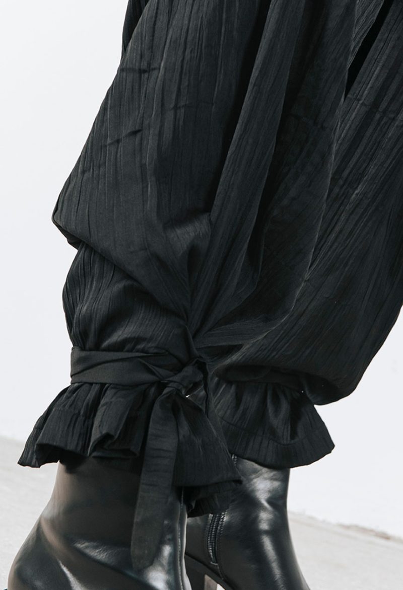 Σατέν παντελόνι με δέσιμο στη μέση και λεπτομέρεις με δεσίματα στο τελείωμα.