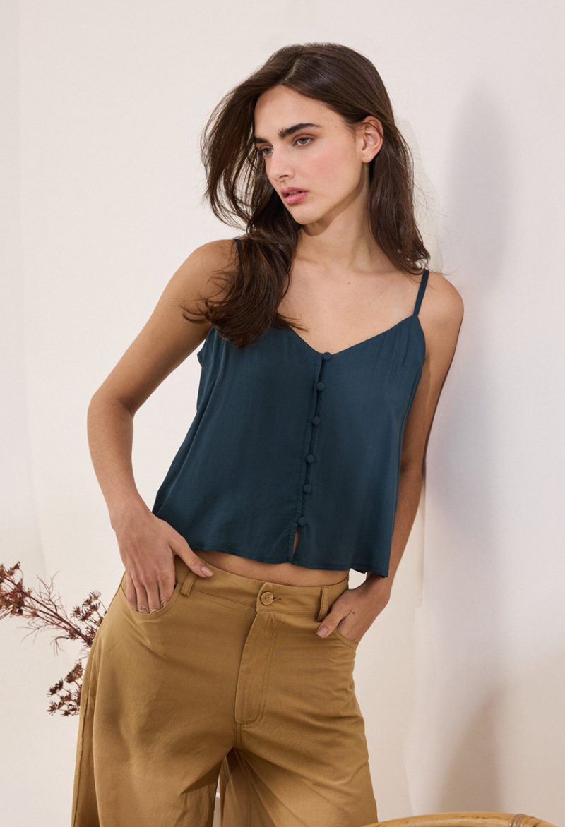 Τοπ από 100% viscose σε cropped μήκος με άνετη γραμμή. Διαθέτει τιράντες με δυνατότητα αυξομείωσης για προσαρμοσμένη εφαρμογή και V λαιμόκοψη. Κλείνει μπροστά σε όλο το μήκος με ντυτά κουμπιά, προσφέροντας κομψή και λιτή λεπτομέρεια στο σχέδιο.