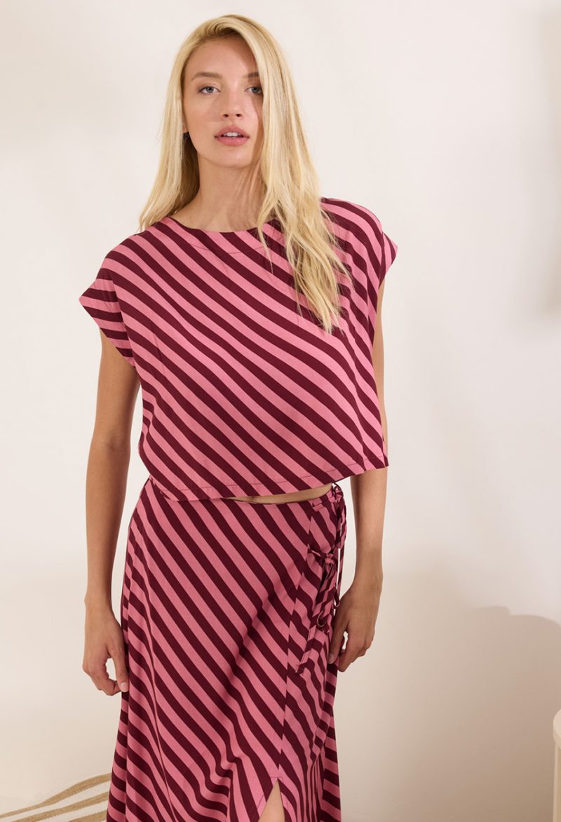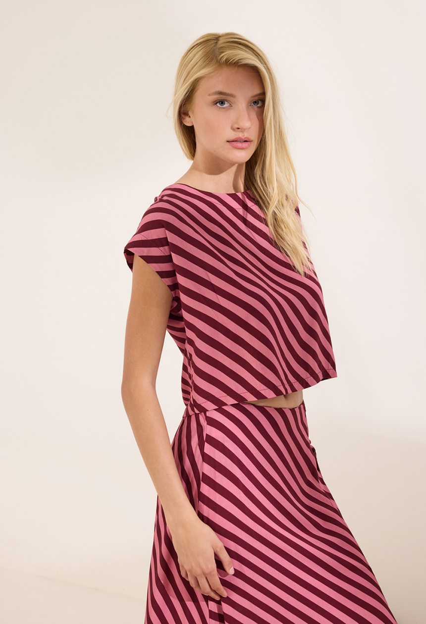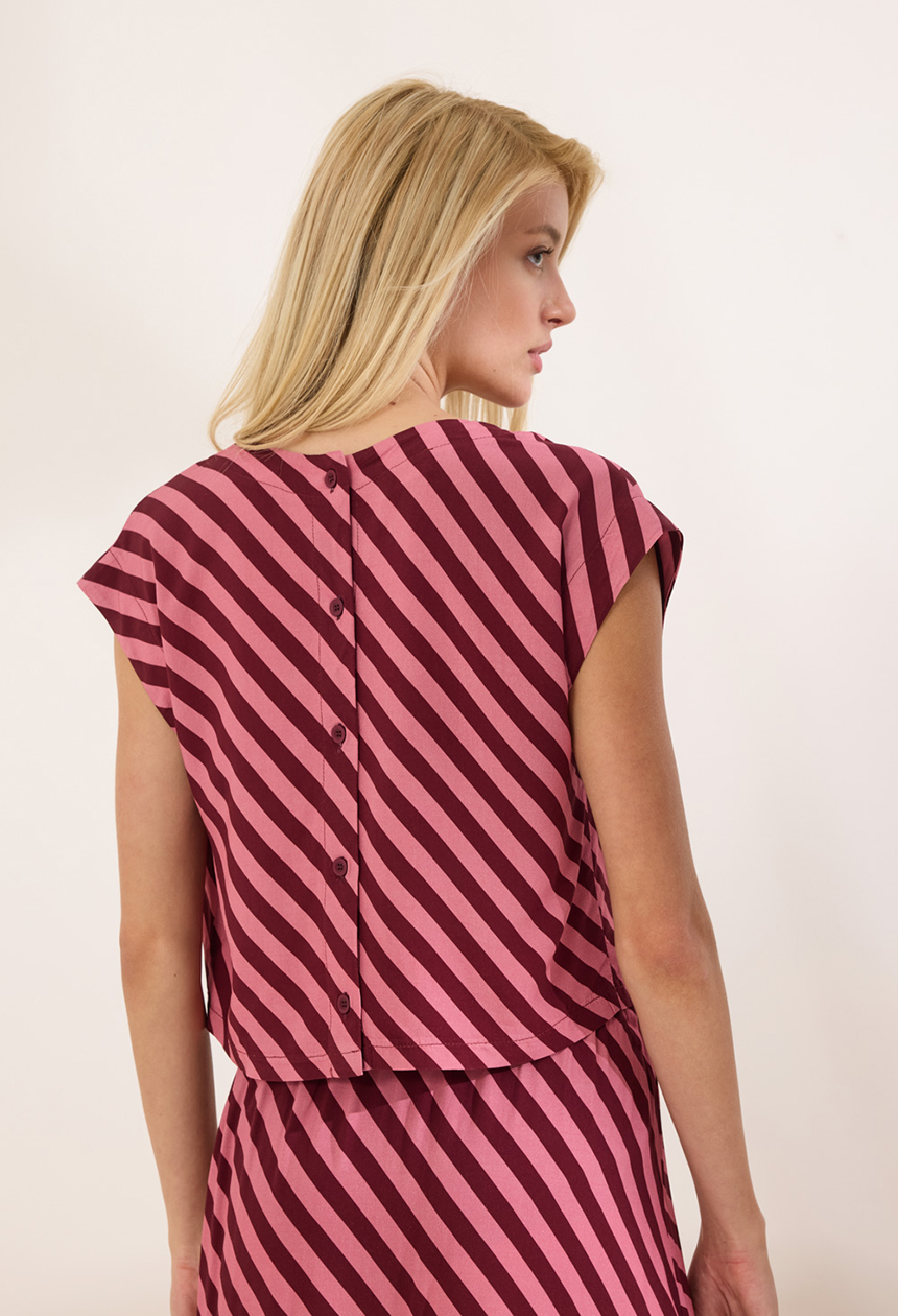 Τουνίκ με κοντό μανίκι και ανοιχτή λαιμόκοψη, σε cropped μήκος με χαλαρή και άνετη γραμμή. Διακοσμείται με έντονο print με ρίγες. Το πίσω μέρος είναι σχεδιαστικό και κλείνει με κουμπιά σε όλο το μήκος. Ιδανικό για να φορεθεί σαν σετ με τη φούστα Kathy για ολοκληρωμένο look.