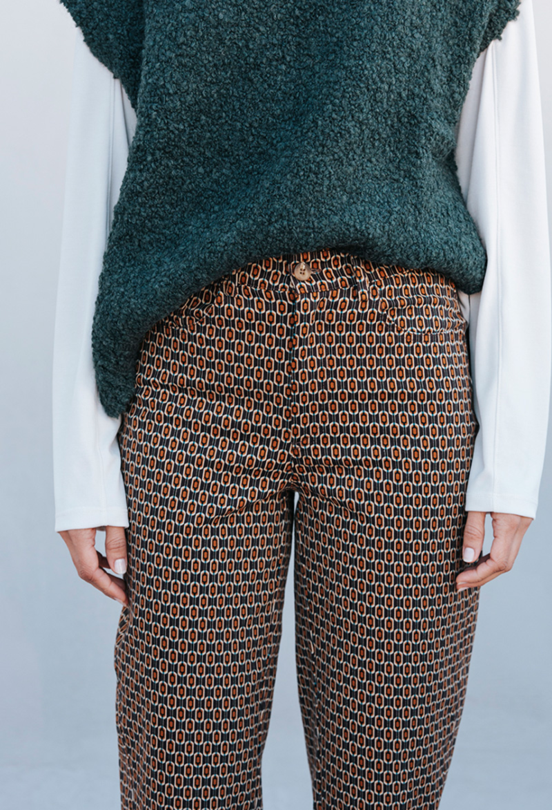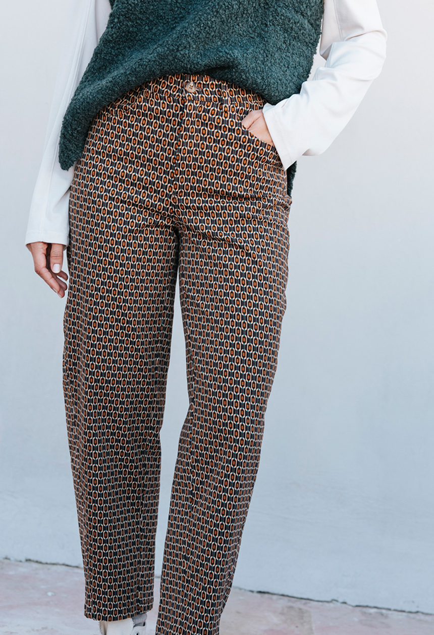 Εμπριμέ πεντάτσεπο παντελόνι βαμβακερό. Kλείσιμο μπροστά με φερμουάρ και κουμπί.