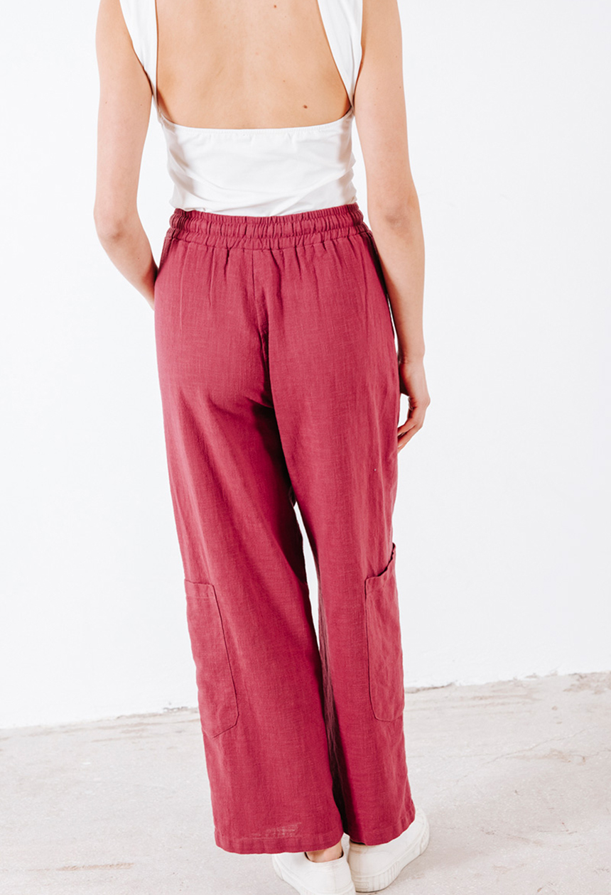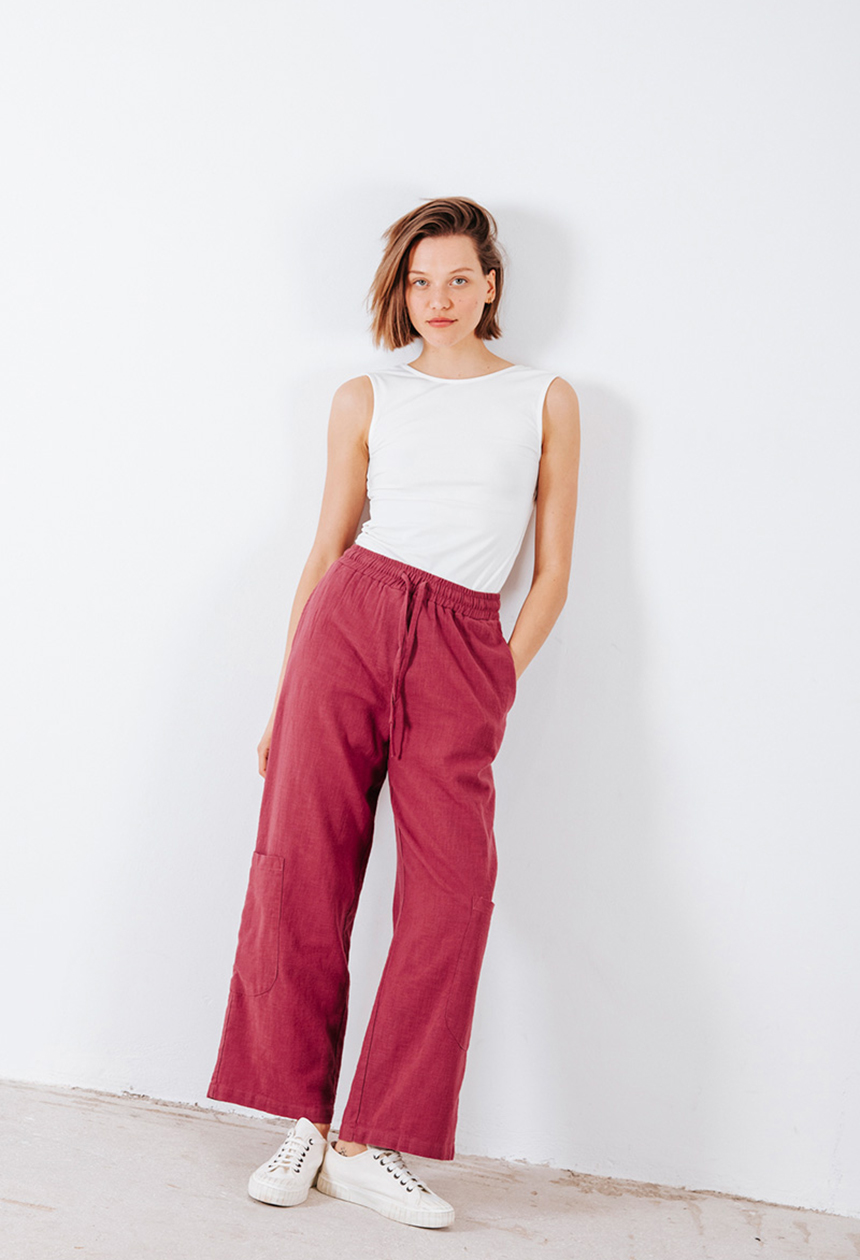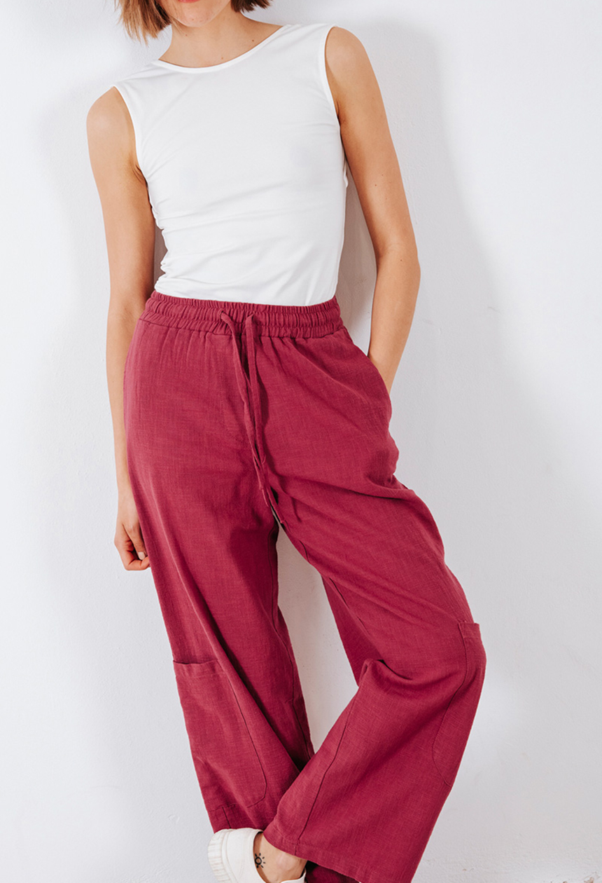 Βαμβακερό παντελόνι με λάστιχο στη μέση και διακοσμητικές τσέπες χαμηλά.