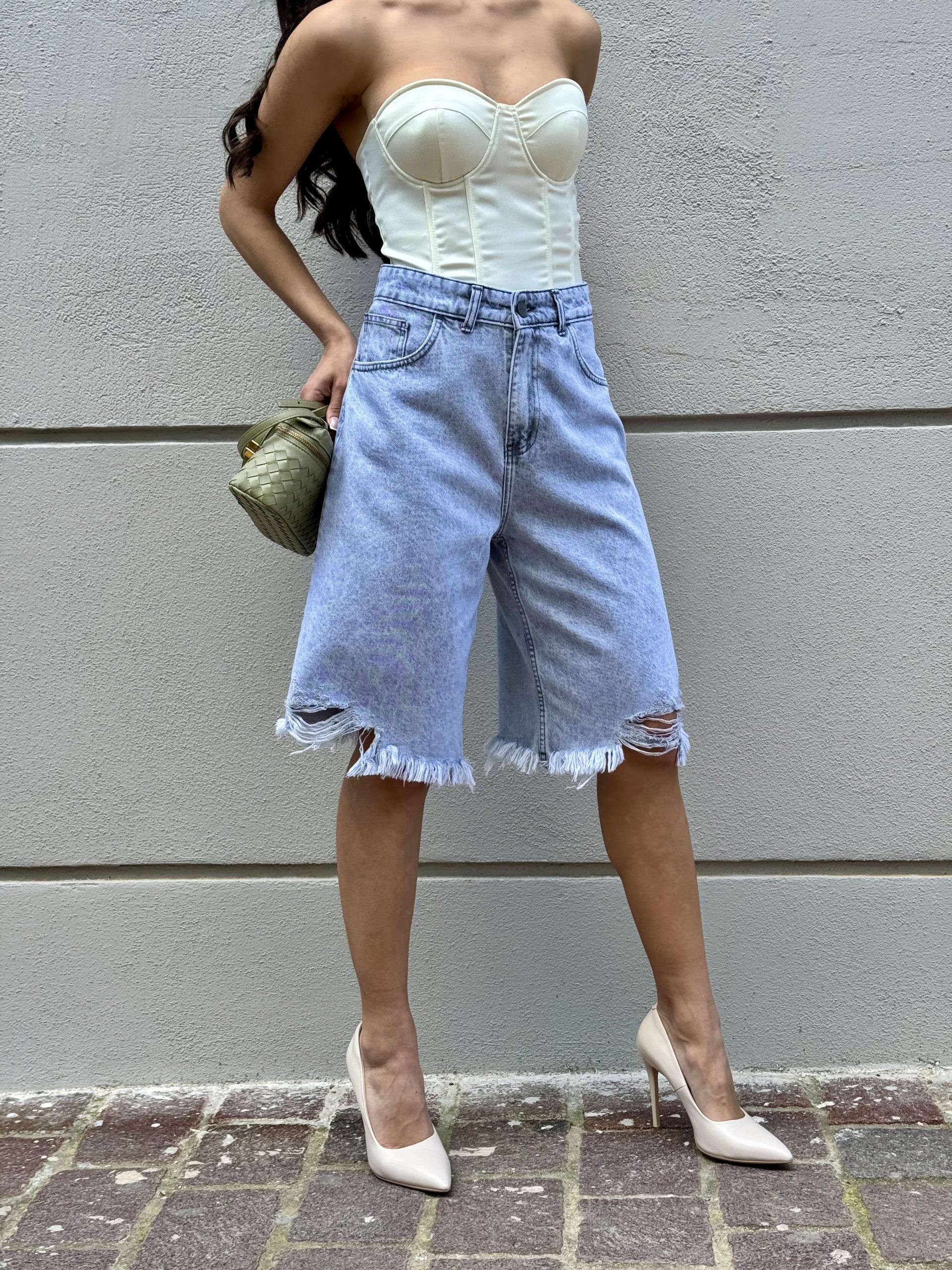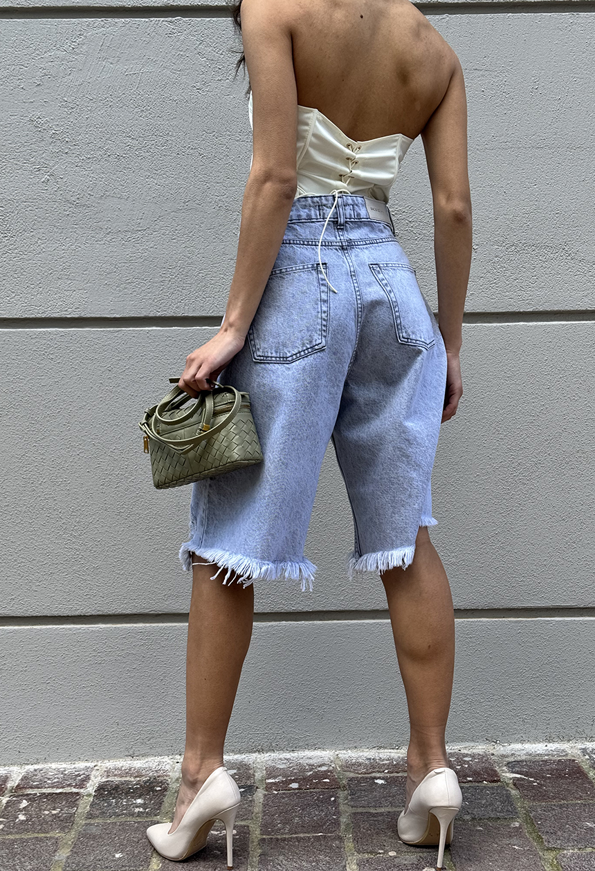 Βερμούδα σεμήκος μέχρι το γόνατο και το ξέφτι στο τελείωμα δίνουν έναν πιο relaxed και ανεπιτήδευτο χαρακτήρα, ενώ το σταθερό denim ύφασμα χαρίζει δομή και διαχρονικότητα.