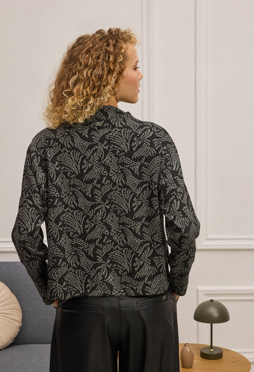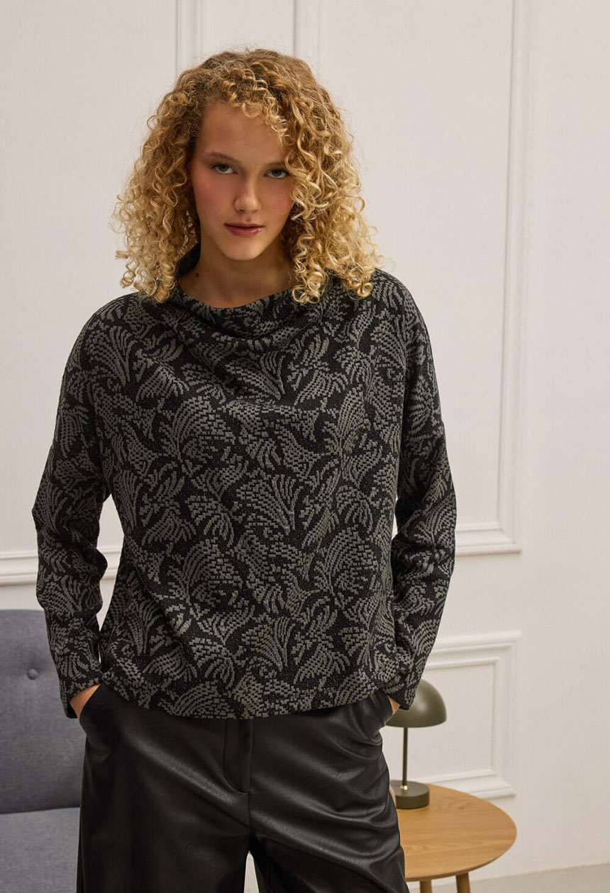 Μπλούζα με all-over σχέδιο σε jacquard ύφανση, που δημιουργεί ανάγλυφη υφή και ξεχωριστή εμφάνιση. Διαθέτει χαλαρή λαιμόκοψη και ίσια γραμμή. Τα μακριά μανίκια και το ήπιο τελείωμα προσφέρουν άνεση και ευκολία στην εφαρμογή.